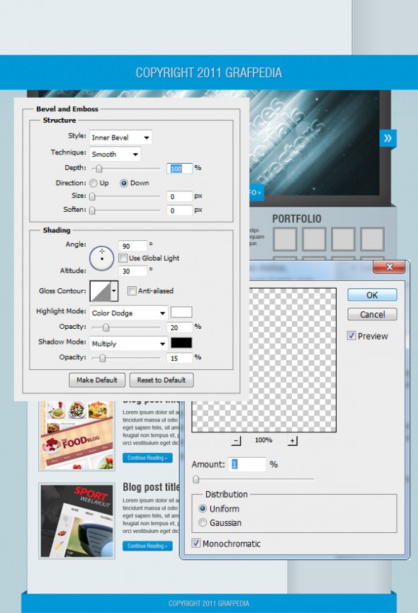 Дважды щелкните на этом слое, чтобы открыть окно Layer Style и используйте следующие настройки. Затем перейдите на Filter> Noise> Add Noise и установите параметры, как на картинке ниже.
