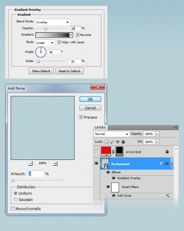 Перейдите к Filter> Noise> Add Noise, установите сумму — 1, Распределение — Равномерное и отметьте Монохромный вариант (the Distribution — Uniform, опция — Monochromatic).
