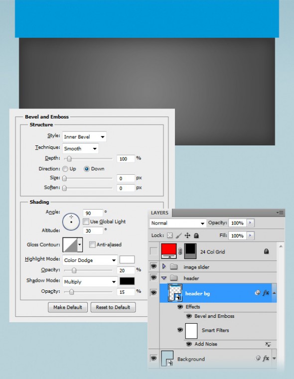 Выберите Rectangle Tool (U) и создайте прямоугольник размером 980px на 140px и цветом # 0098d8. Назовите этот слой „шапка BG“, щелкните правой кнопкой мыши по нему и выберите Convert to Smart Object (Преобразовать в смарт-объект). Дважды щелкните на этом слое, чтобы открыть окно Layer Style. Выберете „Тиснение“ и используйте настройки, как на изображении ниже (Inner bevel — Внутренний скос, Color Dodge - осветление основы, Multiply — умножение).