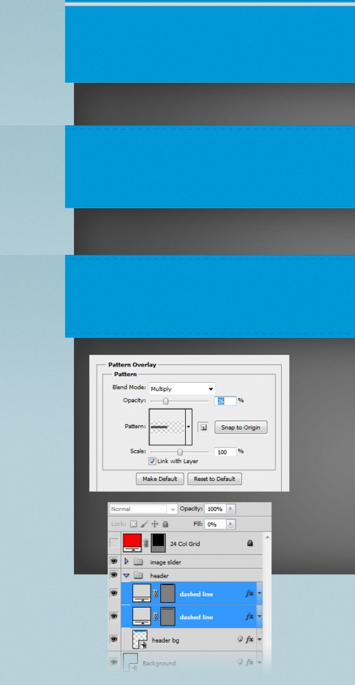 Выберите Rectangle Tool (U) и создайте прямоугольник размером 980px на 5px. Поместите этот прямоугольник в верхнюю часть шапки, как вы видите на изображении ниже. Назовите этот слой „пунктирная линия“ и установить его Fill до 0%. Затем дважды щелкните по нему и используйте настройки из следующих изображений для Pattern Overlay (перекрытие узора).