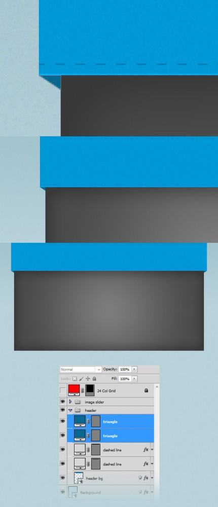 Создайте также два треугольника в верхних углах прямоугольника, используя Pen Tool (P) и цвет # 595959.
