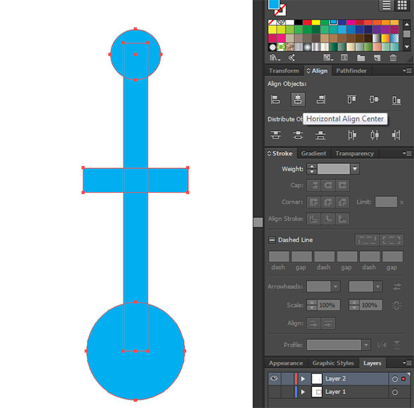 Начнем с создания элементом паттерна. Наш первый элемент — снежинка. При помощи инструментов Ractangle/Прямоугольник и Ellipse/Эллипс создайте два круга и два прямоугольника, которые пересекаются как показано на картинке ниже. Выделите все фигуры и в палитре Align/Выравнивание нажмите на кнопку horizontal Align Center/Горизонтальное выравнивание по центру.