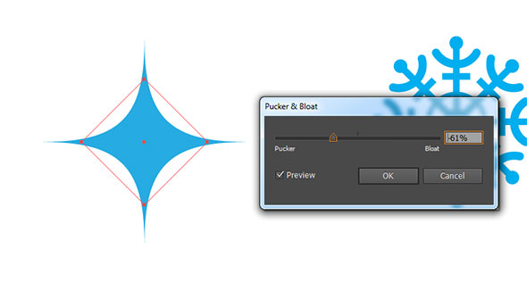В меню выберите Effect>Distort & Transform>Pucker & Bloat/Эффект>Исказить и трансформировать>Втягивание и раздувание. Настройте параметры эффекта, чтобы получилась звездочка как на картинке ниже.