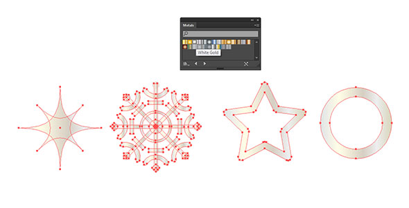 Зайдите в меню Windows/Окна и выберите Swatch Libraries>Gradients>Metals/Библиотеки образцов>Градиенты>Металлы. Выделите все элементы паттерна и кликните по градиенту White Gold/Белое золото.