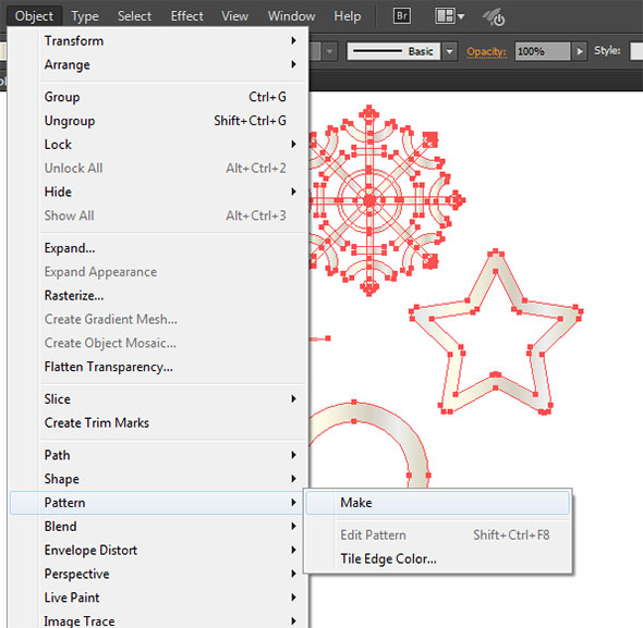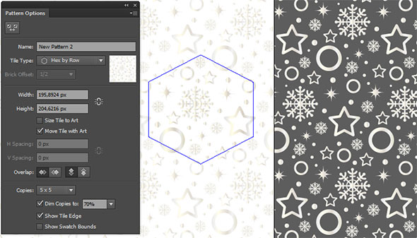 Сгруппируйте отдельно элементы звездочки и снежинки. Разместите элементы паттерна ромбом, выделите их все и в меню выберите Object>Pattern>Make/Объект>Узор>Создать.