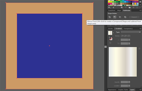 Дублируйте фигуру и при помощи инструмента Scale/Масштабировать уменьшите верхнюю фигуру до размера желаемого выреза в рамке. Выделите обе фигуры и в палитре Pathfinder/Обработка контура нажмите на иконку Minus Front/Минус верхний.