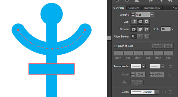 Теперь возьмите инструмент Pen/Перо и нарисуйте кривую, как показано ниже. Укажите ей круглые капители и толщину обводки подходящую к прямоугольникам.