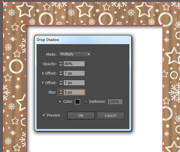 Выделите все три фигуры, составляющие рамку и сгруппируйте их (Ctrl+G). Не снимая выделения, выберите в меню Effect>Stylize>Drop Shadow/Эффект>Стилизация>Тень. Настройте параметры тени как показано ниже. Цвет тени: #330000.