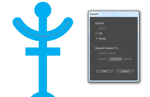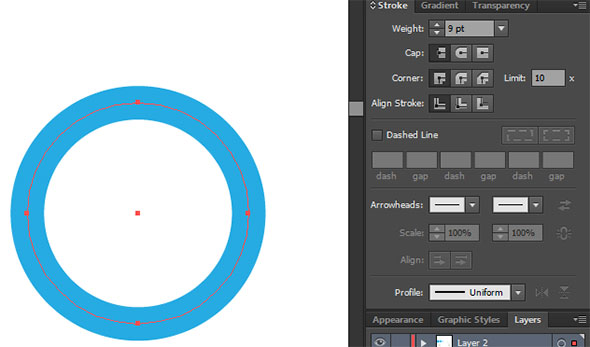 Выделите центральный круг, отправьте его на передний план (Ctrl+Shift+]). Дублируйте центральный круг, возьмите инструмент Free Transform/Свободное трансформирование и, удерживая клавиши Alt и Shift, увеличьте круг. Укажите ему отсутствие заливки и довольно жирную обводку. Не снимайте выделения с круга и разберите его, превратив обводку в заливку, как мы делали это ранее.