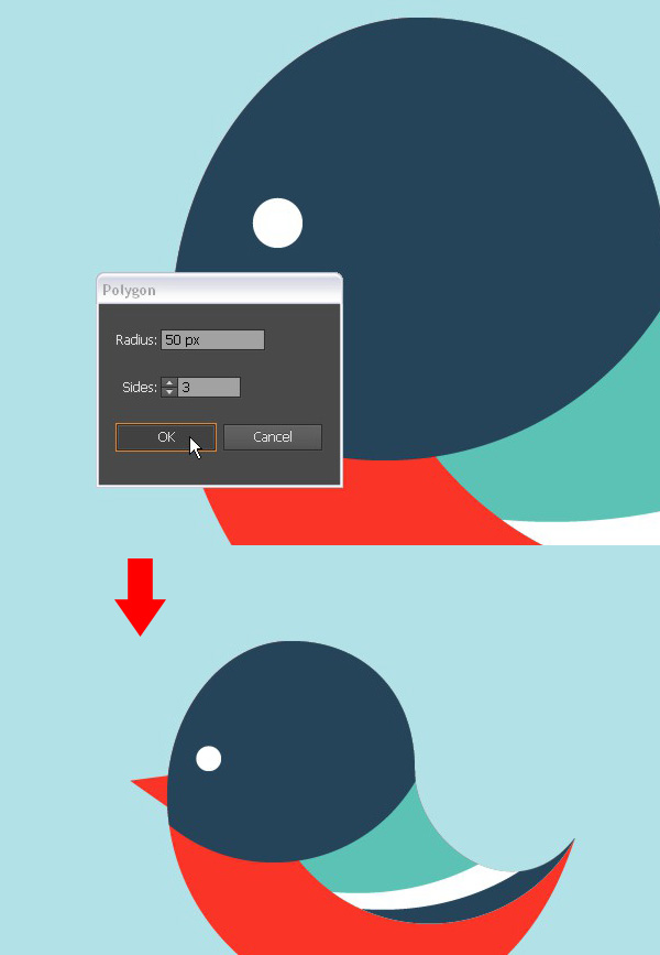 Добавьте круглый белый глаз и клювик. Клюв нарисуйте при помощи инструмента Polygon Tool (многоугольник) указав в настройках 3 стороны, тем самым создав треугольник.