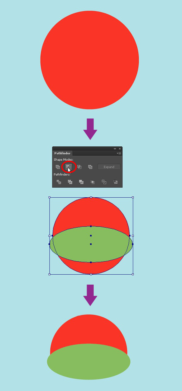 Снова начинаем с красного круга. Нарисуйте приплюснутый овал поверх круга, скопируйте его и вставьте на передний план (Control-C > Control-F). Выделите зеленый овал и красный круг и нажмите Minus Front (минус верхний) в палитре Pathfinder (обработка контуров). Так вы разделите красный круг на две части. Удалите нижнюю.