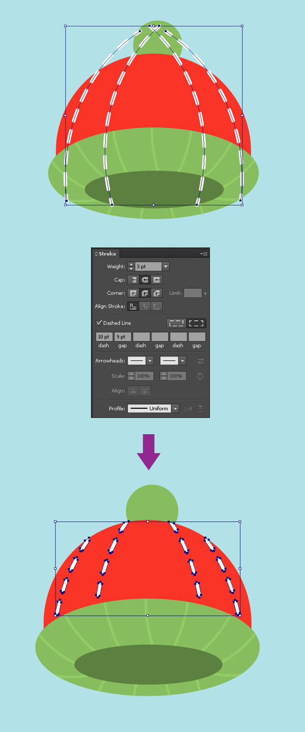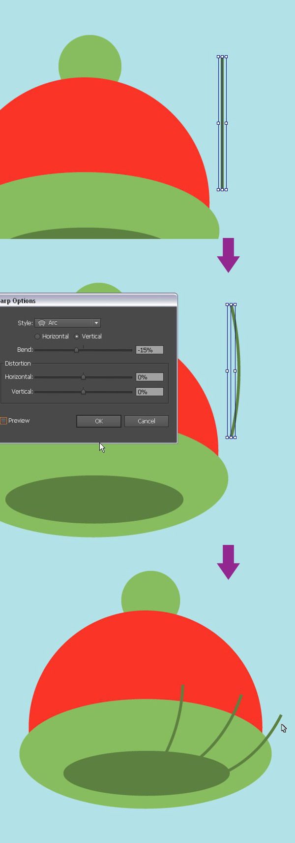 Давайте добавим нашей шапочке деталей. Нарисуйте вертикальную линию при помощи инструменты Line Segment Tool (\) (отрезок линии), зайдите в меню Effect > Warp > Arc (Эффект>Деформация>Дуга) и изогните линию при помощи параметра Bend (изгиб) на -15% по вертикальной оси (Vertical). Дублируйте получившуюся кривую несколько раз и расположите по ободку шапочки.