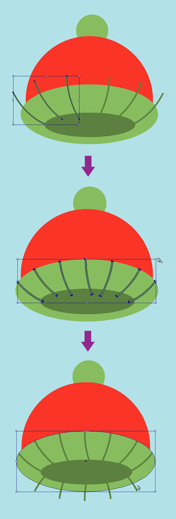 Добавьте больше изгибов в верхней и нижней части обода шапки. Лишние отрезки удалите при помощи инструмента Eraser Tool (Shift-E) (ластик) или опций в палитре Pathfinder (обработка контуров).