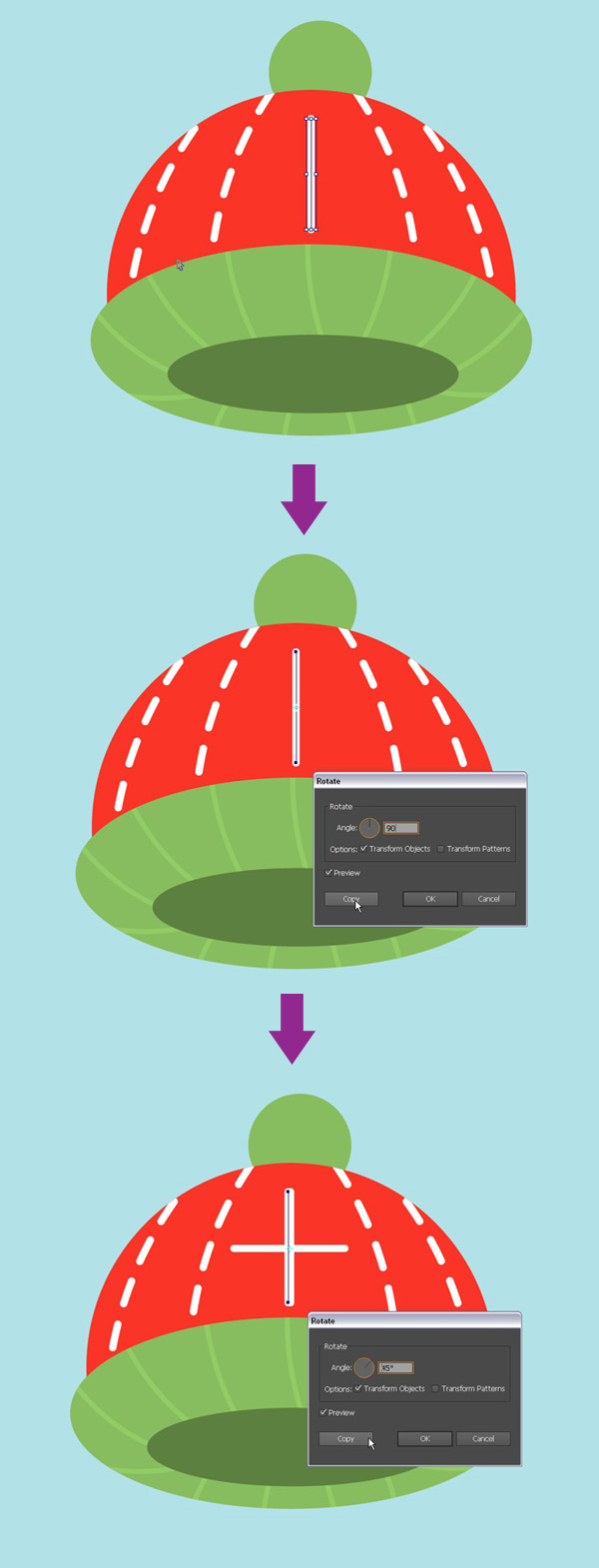 Давайте добавим нашей шапочке декоративный элемент. Нарисуйте вертикальную линию белого цвета, поверните ее на 90 градусов при помощи инструмента Rotate Tool ® (поворот), нажмите кнопку Copy(копия). Затем сделайте то же самое, но у же выберите 45 градусов.