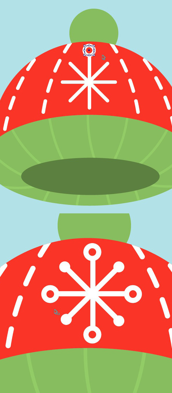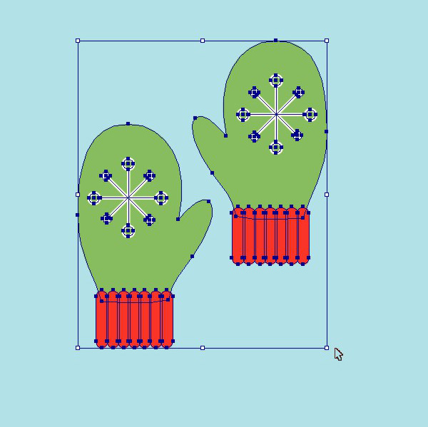 Теперь скопируйте снежинку с шапочки и вставьте ее на варежку. Выделите все элементы составляющие варежку, дублируйте и отразите по вертикали при помощи инструмента Reflect Tool (O) (зеркальное отражение).