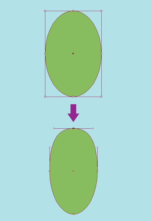 Нарисуйте вытянутый овал зеленого цвета. Потяните за каждый из манипуляторов верхней точки удлиняя их, что сделать верхнюю часть фигуры более тупой.