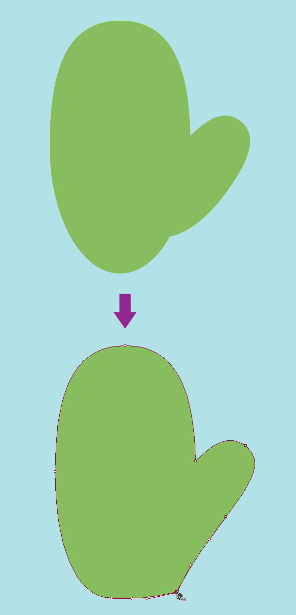 Добавьте еще один овал для большого пальца. Объедините обе фигуры при помощи кнопки Unite (объединить) в палитре Pathfinder (обработка контуров). Подкорректируйте точки и манипуляторы, чтобы сделать фигуру более похожей на форму варежки.