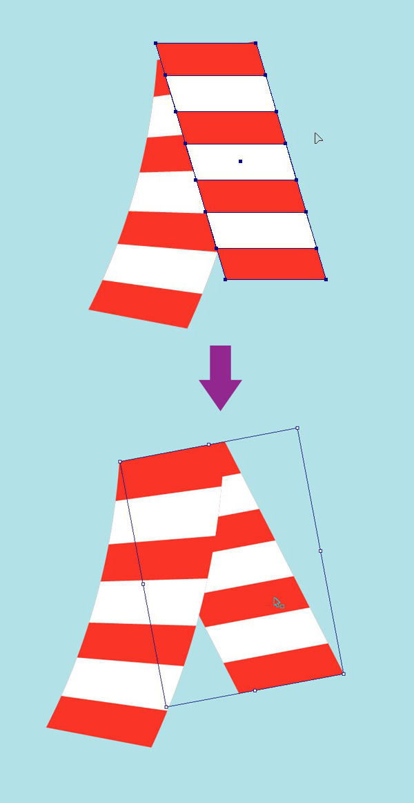 С шарфиком все просто: перед тем как применить эффект Arc/Дуга, выделите шарф и все полоски и сгруппируйте их, нажав Ctrl+G. Тогда эффект будет применен к ним как к одному объекту, а не как к каждому элементу в отдельности. Почему-то в оригинале урока этот шаг не был предусмотрен.