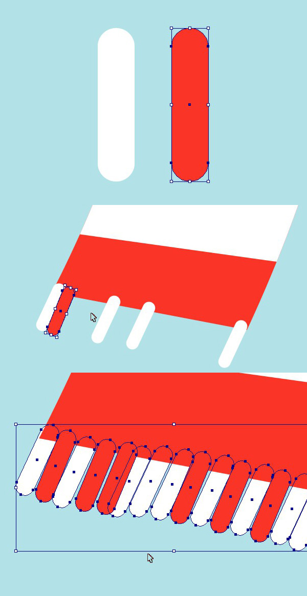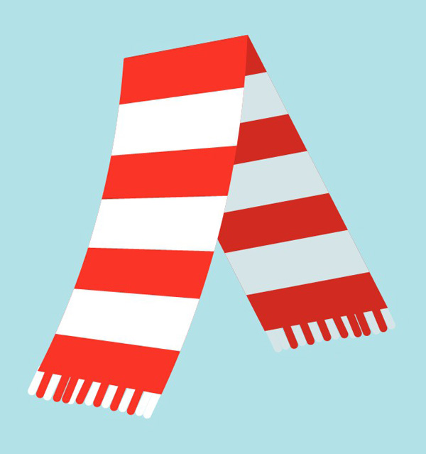 Давайте украсим шарф! Инструментом Rounded Rectangle Tool (Прямоугольник со скругленными углами) нарисуйте две фигуры и закрасьте их красным и белым цветами. Дублируйте фигуры и размещайте их по краю шарфа, чтобы создать бахрому.