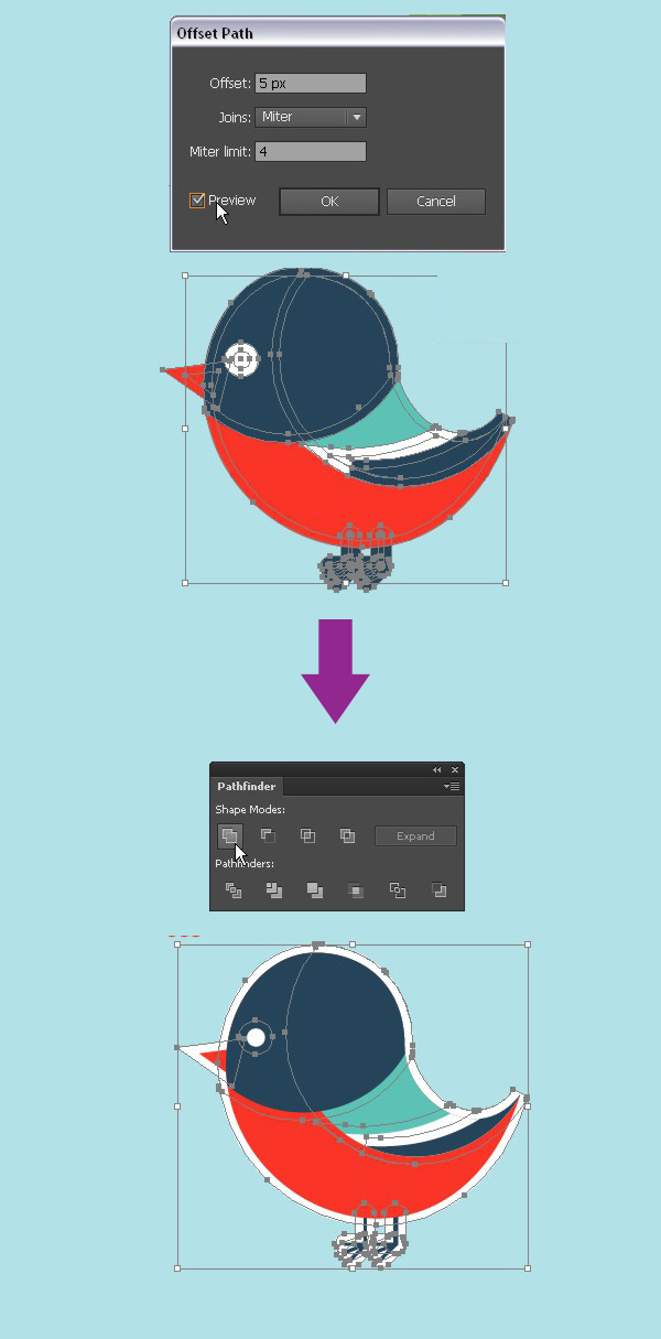 Круг головы и тело птички обязательно должны пересекаться. Выделите и круг и тело и нажмите Intersect (пересечение) в палитре Pathfinder (обработка контуров).
