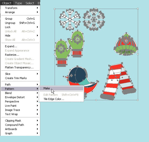 Теперь выделите все элементы и в меню выберите Object > Pattern > Make (Объект>Узор>Создать).