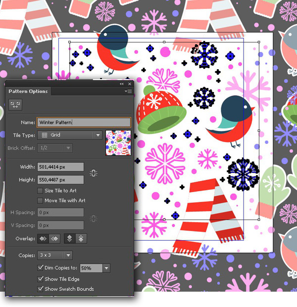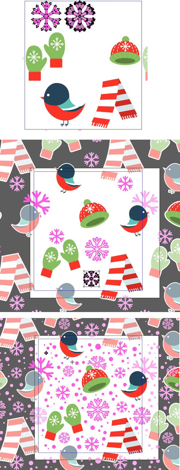 Разместите элементы так, как вам нравится. Полупрозрачные копии элементов помогут вас увидеть как будет выглядеть паттерн в результате. Цвет снежинок был изменен, чтобы их было видно на белом фоне. Добавьте также кружочки-точки, чтобы заполнить пустые места в узоре.