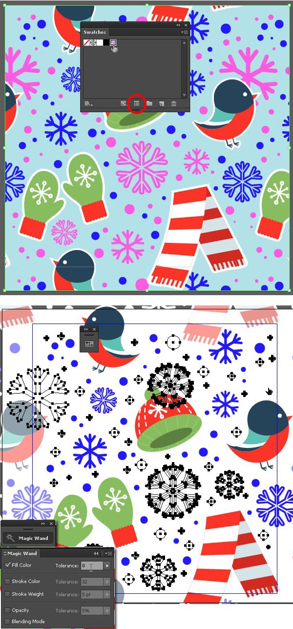 Теперь давайте изменим цвета наших снежинок и точек. Кликните дважды по инструменту Magic Wand Tool (Y) (Волшебная палочка) и укажите в параметре Tolerance (допуск) значение 0. Так инструмнт будет выделять только объекты залитые одним цветом. Теперь кликните по сиреневой снежинке и смените цвет заливки на белый. Теперь кликните по синей снежинке и смените цвет на бледно-синий.