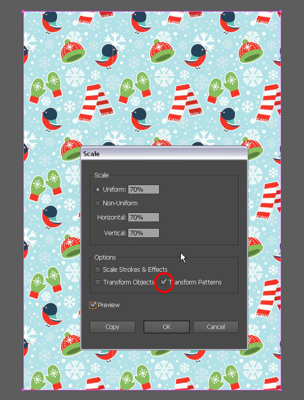 Теперь давайте опробуем паттерн! Мы можем применить его к любой фигуре (пусть это будет прямоугольник). Также мы можем менять размеры паттерна при помощи инструмента Scale Tool (S) (масштаб), выбрав вариант Transform Patterns(трансформирование узоров) в окне опций инструмента.