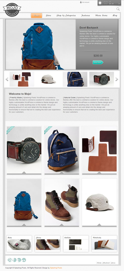 6. Storemerce— тема от Theme Forest , которая использует Cart66 ecommerce plugin. Пользователи могут выбирать текстуру и цвет фона и изменять цвет некоторых элементов.