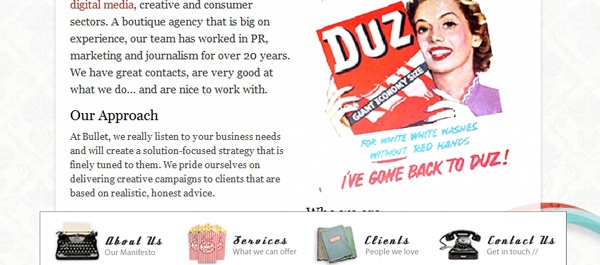 Потрясающая подборка, просто завораживающие работы! Плохо только, что в Рунете никто фактически не делает сайтов в таком направлении, нашла единственную веб-студию, но ребята делают просто суперсайты в ретростиле, винтажные и вообще с мультипликацией красивой. Прямо гордость за державу взяла! И наши могут, если захотят! Как-будто в прошлое погружаешься: vebk.ru