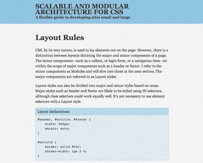 на этом сайте-книге Снук рассказывает, что прячется за термином SMACSS — (произносится как «смэкс»), о средствах для изучения процесса проектирования и переходе от жестких рамок к гибкому процессу мышления, позволяющему подойти последовательно к разработке сайта средствами CSS.
