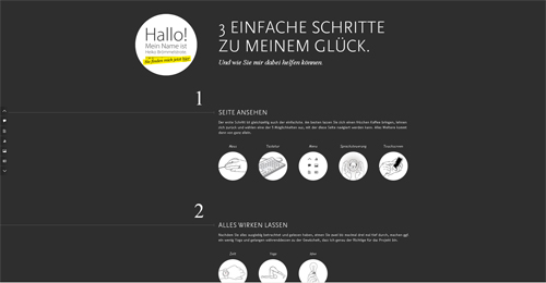 13. Оригинальный сайт немецкого дизайнера Heiko Brömmelstrote. Для управления сайтом существуют едва заметный ряд кнопок слева. Можно совершить настоящее путешествие по резюме дизайнера. Интересно, что Хэйко детально расписывает свой рабочий день, привычки. Хобби и увлечения отображает в иллюстрациях, а "таланты" и социальные качества в диаграммах.