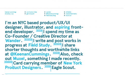 17. Keenan Cummings - сайт американского дизайнера и иллюстратора. Главная страница сайта — рассказ о себе — краткий, но содержательный, а каждый флажок в тексте ведет на отдельный сайт, аккаунт в соцсетях, блог или страницу сайта, где можно более детально познакомиться как с работами, так и с личностью дизайнера.