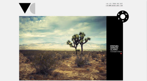 20. Сайт талантливого фотографа Стефана Вернона Кларка. Главный элемент веб-интерфейса сайта — фотографии, но чтобы разобраться, детальнее просмотреть работы и ознакомиться с творчеством Кларка — изучите незатейливое колесико в левом верхнем углу фотографий. Интересно реализована подпись каждого из раздела. Имя раздела сайта или вывод на блог появляется всредине «колеса».