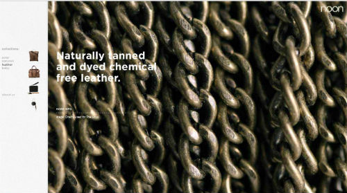 7. Оригинальная презентация магазина сумок Noonstyle. Меню чуть заметно в правой части сайта, зато на весь экран выводится фотография, которая как-будто имитирует текстуру изделья.
