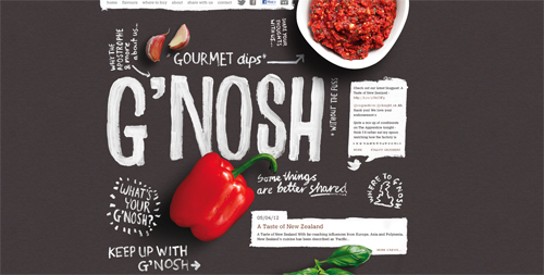 1. Сайт Gnosh сразу же удивляет нас своим меню. Сначало — не знаешь, куда необходимо «нажимать», а потом привыкаешь, что все меню содержится в надписях — при наведении записи меню обводятся. При этом само меню раскидано по странице сайта.
