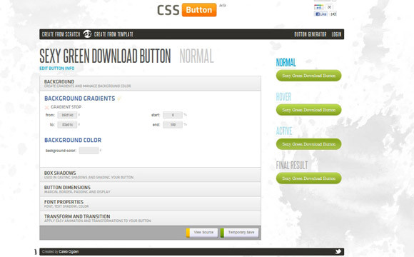 CSSButton представляет собой интернет-генератор кнопок. Не требуется много навыков кодирования, всё что вам нужно сделать, это поиграть с параметрами и создать три состояния кнопки. Вы можете начать с нуля или воспользоваться шаблоном.