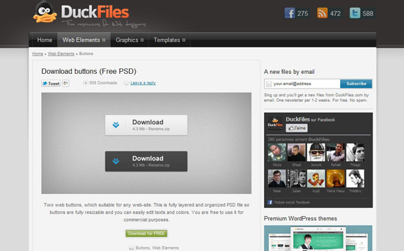 Duckfiles предоставляет бесплатные и высококачественные ресурсы для веб-дизайнеров. Категория «Кнопки» демонстрирует хорошие примеры PSD-шаблонов, которые можно скачать.