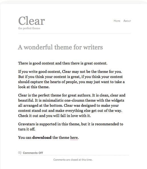 Если вы — писатель, которому нужна идеальная тема для презентации своих работ, то эта бесплатная тема с официального сайта WordPress подойдет вам, как нельзя лучше. Она не обременена сложным дизайном, кучей функций и опций, ненужных вам. Тема Clear разработана исключительно с целью показать сам контент, оставляя вне поля зрения все остальное.