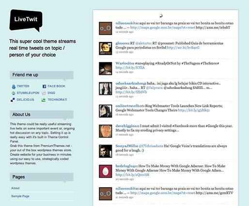 Возможно, самая необычная бесплатная тема 2011 года, ее нельзя было не включить. LiveTwit в реальном времени отображает твитты, которые вы выберете. Это довольно необычная идея, которая может оказаться очень востребованной.