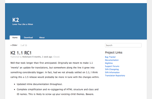 Пусть вас не отпугнет минималистический вид темы K2. На первый взгляд она больше напоминает вариант продолжения стандартной темы Kubrick, которую все мы неоднократно видели, устанавливая WordPress годах в 2007—2009. На самом деле, K2 — это, скорее, каркасная основа с замечательными особенностями, такими как динамическое масштабирование. В зависимости от ширины браузера пользователя, контент может располагаться в 3, 2 или даже 1 колонку. Специально разработанный поисковой инструмент заслуживает особого внимания. В окошке поиска автоматически подставляются результаты поиска, наподобие того, как это происходит в Google Instant, что однозначно идет пользователю на пользу. Если вы ищете тему для WordPress в качестве холста для создания собственного шедевра — непременно рассмотрите вариант темы K2.