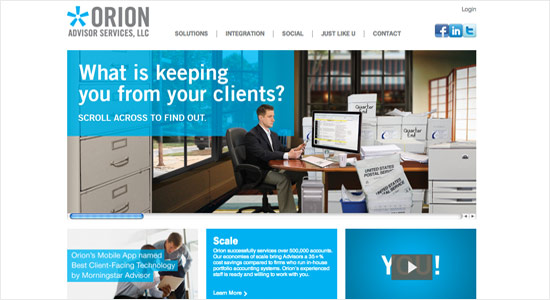 Синий цвет означает опыт и надежность. С помощью такого сайта Orion Advisor хочет стимулировать клиентов к доверию.