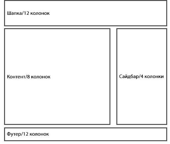 <div class="row"> <div class="twelve columns"> <h2>Шапка/12 колонок</h2> </div> </div> <div class="row"> <div class="twelve columns"> <div class="row"> <div class="eight columns"> <h2>Контент/8 колонок</h2> </div> <div class="four columns"> <h2>Сайдбар/4 колонки</h2> </div> </div> </div> </div> <div class="row"> <div class="twelve columns"> <h2>Футер/12 колонок</h2> </div> </div>