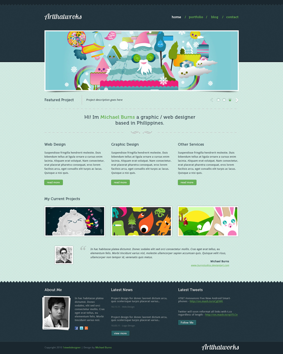 Секция футера будет разделена на 3 колонки. 1-ая колонка для раздела обо мне (about), 2-я для последних новостей (latest news), и 3-я — для последних публикаций на Твиттере ( latest tweets).