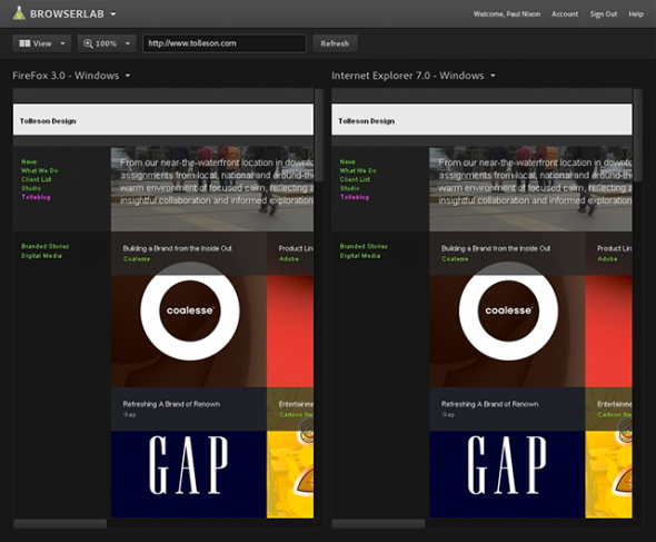 Adobe BrowserLab — бесплатный инструмент тестирования кроссбраузерности от Adobe. Он как через Windows, так и через Mac OS, позволяет протестировать сайт в современных и некоторых устаревших браузерах, включая различные версии Chrome, Safari, IE и Firefox. Просмотр возможен в нескольких режимах: полноэкранном, в режиме сравнения, а также в режиме «наложенных слоев». Сервис может получать доступ к страницам, размещенным в интернете, или работать локально как дополнение к Firebug или Adobe Dreamweaver CS5.
