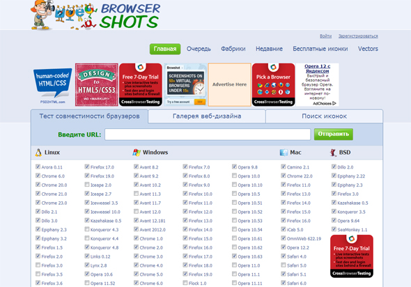 Данный сервис поддерживает большое количество браузеров — более 164 комбинации браузеров на четырех операционных системах (Windows, Mac, Linux, BSD). Некоторые из них могут даже не понадобиться. Маловероятно, что найдется пользователь, который работает в браузере Dillo или Kazehakase в операционной системе BSD, хотя все равно можете проверить.