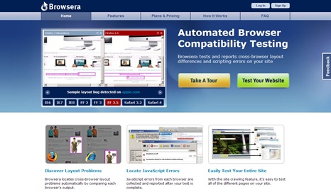 Browsera обеспечивает автоматический тест на совместимость. На результатах проверки выделяются различия в видах вывода дизайна в разных браузерах, что существенно облегчает процесс. Также определяются ошибки JavaScript. Коммерческий вариант сервиса может проводить проверки страниц, требующих регистрации пользователя.