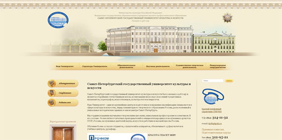 А чем не угодил, например, сайт «Санкт-Петербургского государственного университета культуры и искусств»? Да, кнопочки сейчас так не рисуют. Но и только!
