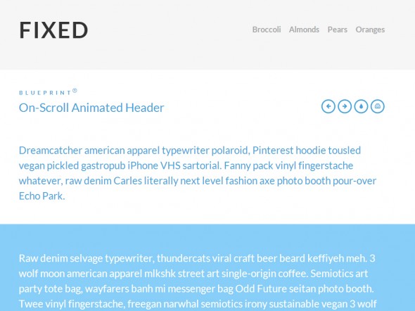 <div class="cbp-af-header"> <div class="cbp-af-inner"> <h1>Fixed</h1> <nav> <a href="#">Broccoli</a> <a href="#">Almonds</a> <a href="#">Pears</a> <a href="#">Oranges</a> </nav> </div> </div>