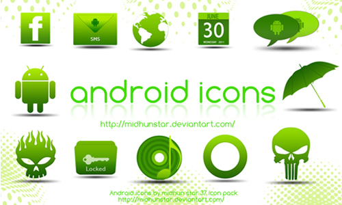Иконки под Андроид в зеленом тоне от midhunstar. Крупные PNG на прозрачном фоне в количестве 37 штук.